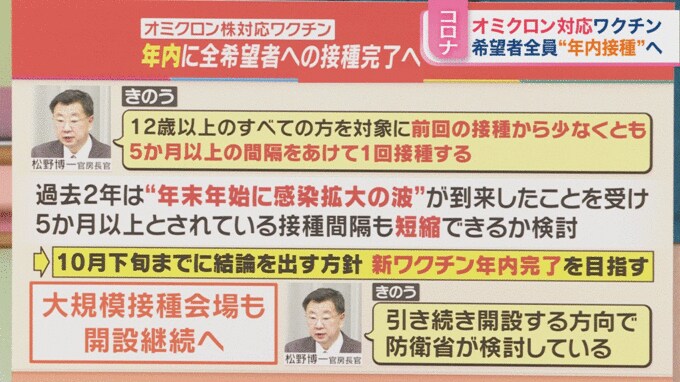 ただ、過去2年、年末年始に感染拡大の波が到来したことを受け、5か月以上とされている接種間隔についても、短縮できるか検討しているということです。詳細については10月下旬までに結論を出す方針で、希望者全員に新ワクチンの年内接種完了を目指すということです。