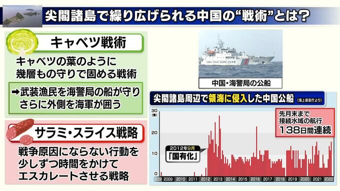 占領したい地域でまず多くの漁船が操業する。漁船なので領海を侵犯しても戦争にはならない。次に“漁船の安全を確保する目的”で中国海警局の船が周辺を囲む。次にそれを守るという名目で海軍が周囲を囲む。キャベツのように幾重にも囲み、いつしか、敵に反撃の機会すら与えずにその地域の領有権を既成事実化する。南シナ海・南沙諸島で実行した。
