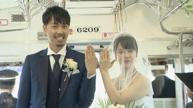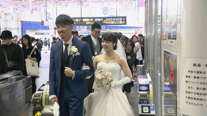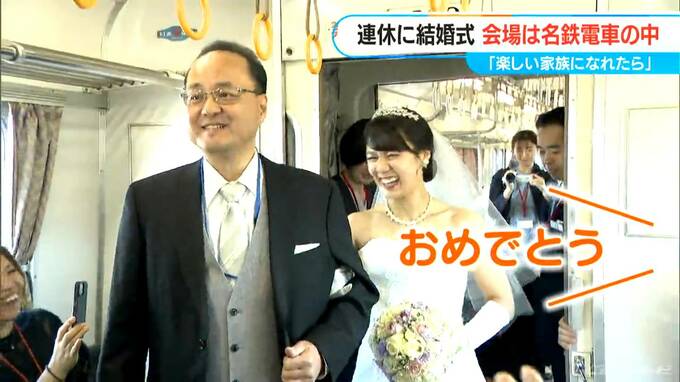 3日、名古屋市の名鉄金山駅に1組の新郎新婦の姿が。2人がホームで待っていたのは…緑色に塗装され、ことし運行が始まった特別な電車です。この電車に乗り込むと、「きゃ~」「おめでとう」と声がかかりました。