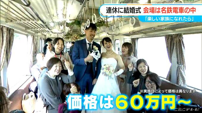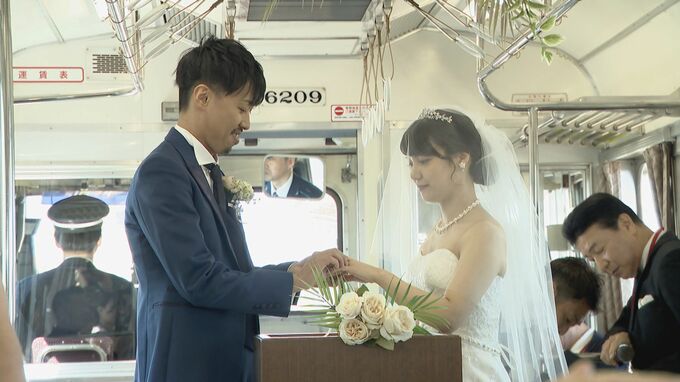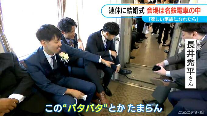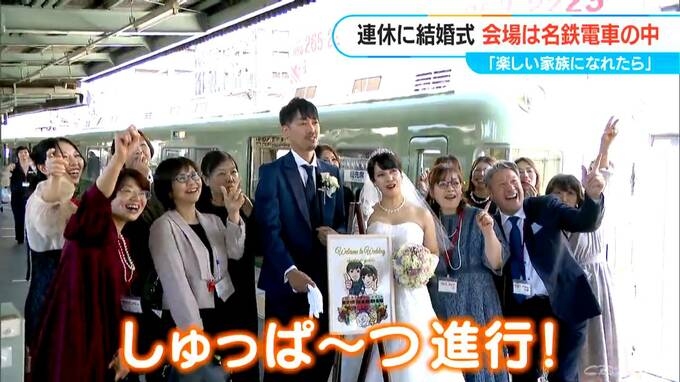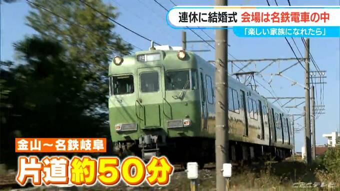 結婚式が始まりました。金山駅から名鉄岐阜駅まで片道およそ50分、電車を貸し切って行われた結婚式は、名鉄グループのANAクラウンプラザホテルグランコート名古屋が、ことし4月から1年間限定で始めたサービスで、電車が大好きな新郎の長井秀平さんのために、新婦の幸穂さんが申し込んだそうです。