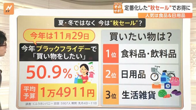 くふうカンパニーが10月4日から11日に5907人を対象に調査したところ、50.9%が今年ブラックフライデーで「買い物をしたい」と回答。平均予算は1万4911円だということです。