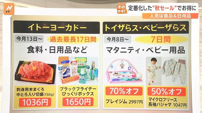 また「イトーヨーカドー」は、11月13日から過去最長の17日間にわたり、食料・日用品などのセールを予定。「トイザらス」「ベビーザらス」は、11月8日から7日間、マタニティやベビー用品を安く販売します。