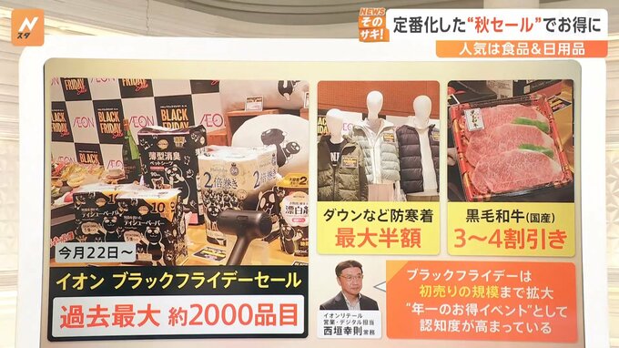 「イオン」は、11月22日から「イオン ブラックフライデーセール」として、過去最大の約2000品目のセールを予定しています。ダウンなどの防寒着は最大半額、黒毛和牛(国産)は3~4割引きになるそう。