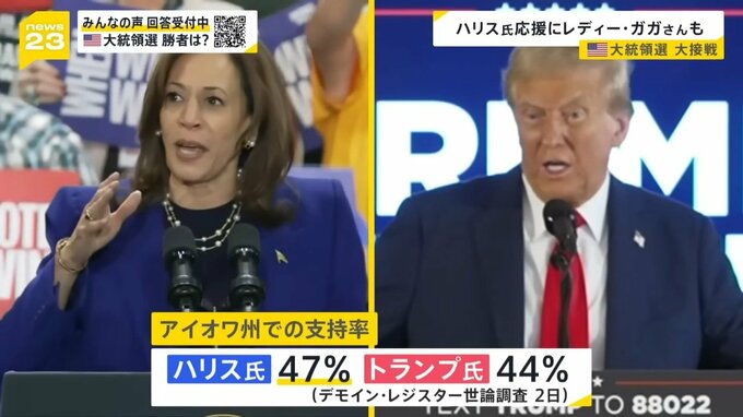一方、トランプ氏優勢とされ、激戦州に含まれていない中西部・アイオワ州では、ハリス氏の支持が上回ったとの世論調査が発表されています。