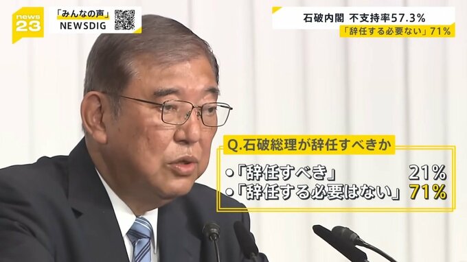 一方、与党が15年ぶりに過半数を割り込んだ衆議院選挙の結果を受け、石破総理が辞任すべきかどうか聞いたところ、▼「辞任すべき」が21%、▼「辞任する必要はない」が71%と続投を容認する声が多く聞かれました。