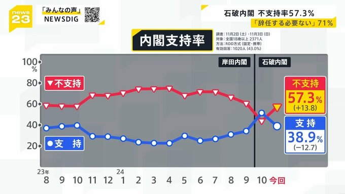その石破内閣の支持率などについて、JNNの最新の世論調査が出ました。内閣支持率は▼支持:38.9%(10月調査からマイナス12.7ポイント)、▼不支持:57.3%(10月調査からプラス13.8ポイント)でした。