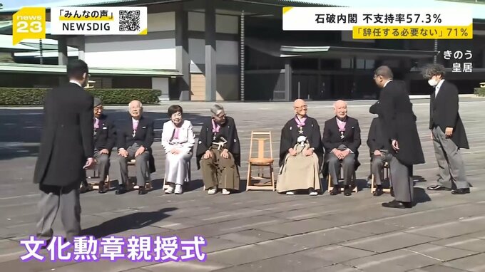 3連休半ばの11月3日、文化勲章の親授式に出席した石破総理。「あしたのジョー」で知られる漫画家・ちばてつやさん(85)ら7人と並んで笑顔を見せていました。