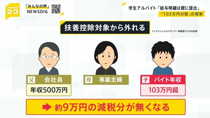 というのも、103万円を超えると扶養控除の対象から外れることに。例えば、父親の年収が500万円で母親が専業主婦、子どもが学生のケース。その子どもがアルバイトなどで年収が103万円を超えた場合、扶養控除が受けられなくなり、約9万円分の減税がなくなることになるのです。