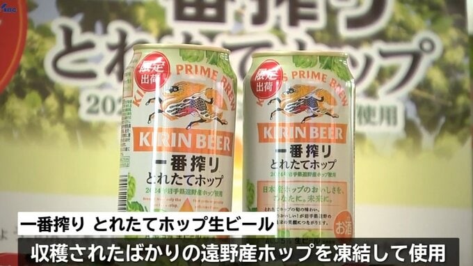 発売21年目を迎えたキリンビールの「一番搾りとれたてホップ生ビール」は、2024年、遠野市で収穫したばかりのホップを24時間以内に凍結して使用していてさわやかな味わいと香りが特徴です。
