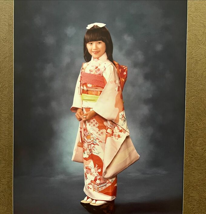 続けて「40年前に着た私のお着物を身に纏い 扇子は私の母の七五三の時のもの」と、次女の七五三の写真を添えて説明しました。