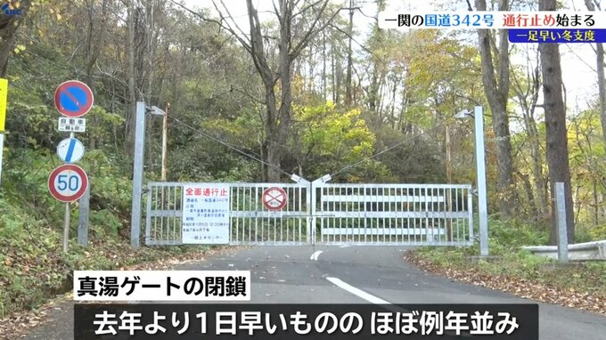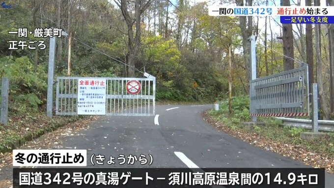 冬の通行止めが始まったのは、一関市厳美町の国道342号、真湯ゲートと須川高原温泉の間の14.9キロの区間です。
