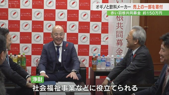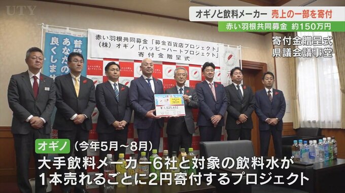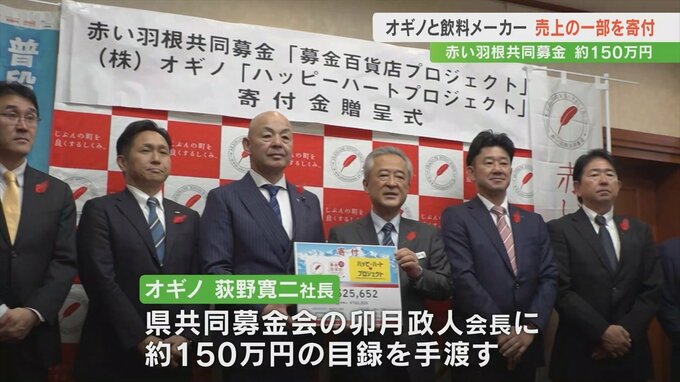 今年は期間中に約76万本が売れきょうはオギノの荻野寛二社長が県共同募金会の卯月政人会長におよそ150万円の目録を手渡しました。
