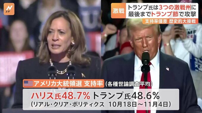 アメリカ大統領選挙の投票が日本時間の今夜、始まります。選挙戦最終日、トランプ氏、ハリス氏はそれぞれ激戦州を飛び回り、先ほど最後の集会で支持を訴えました。記者「いよいよ選挙戦、最終日。ハリス副大統領は…