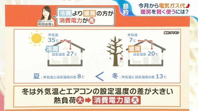節約アドバイザーの和田由貴さんによると、消費電力が高いのは「冷房」よりも「暖房」。