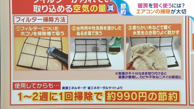 資源エネルギー庁の省エネポータルサイトによると、使用を始めてからも1~2週間に一回掃除することで、約990円の節約につながります。