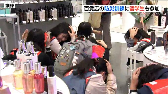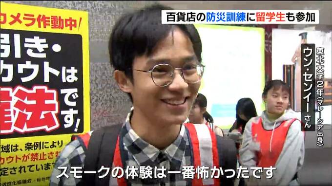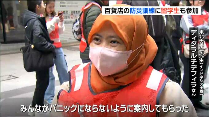 仙台市の百貨店「藤崎」の防災訓練に東北大学の留学生らが参加し、災害が起きた時の外国人客への対応を確認しました。