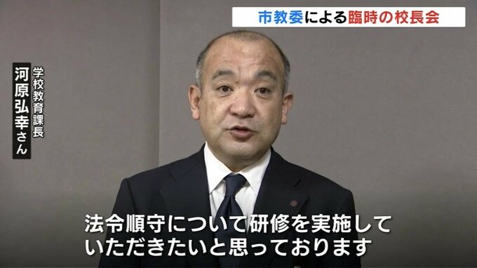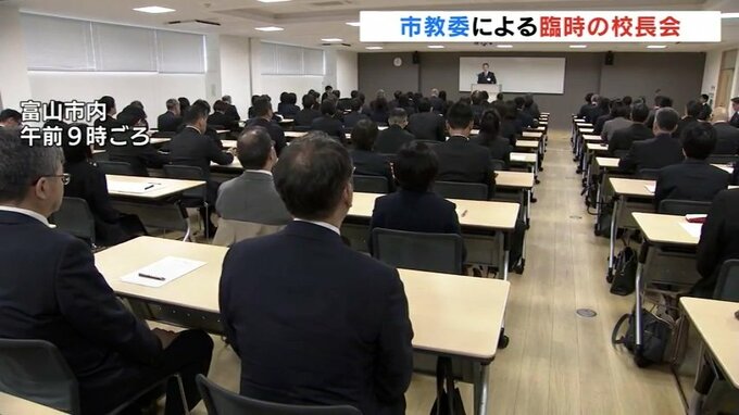 富山市内の小学校の校長が逮捕された問題を受け、富山市教育委員会は6日朝、臨時の校長会を開き、市内の小中学校の校長と幼稚園の園長合わせて90人を集め、綱紀粛正を呼びかけました。