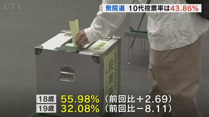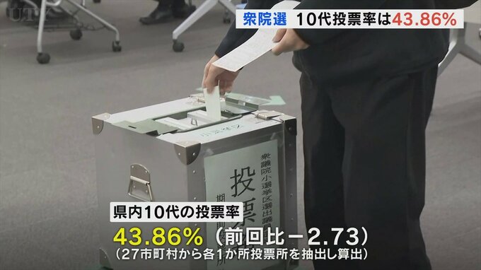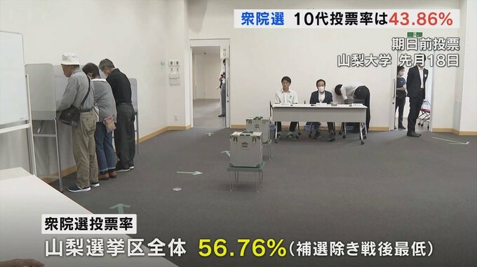 10月27日に行われた衆議院選挙で山梨選挙区の10代の投票率は43.86%となり3年前の前回より約3ポイント低下しました。