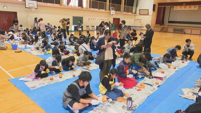 約70人の全校児童は近所の畑で収穫した柿の皮むきをリレー形式で競いました。