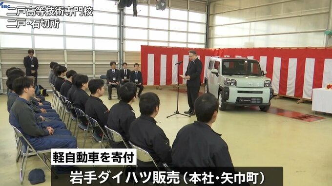 自動車整備士を目指す人たちに役立ててもらおうと、岩手県内の自動車販売会社が、岩手県二戸市の高等技術専門校に軽自動車1台を寄付しました。