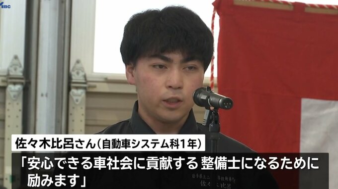 自動車システム科1年の佐々木比呂さんは「安心できる車社会に貢献する整備士になるために励みます」と感謝の気持ちを伝えました。