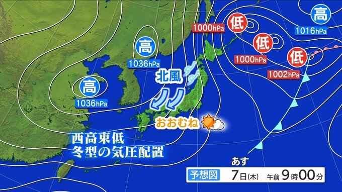 7日(木)おおむね晴れる一日 北部内陸部を中心に雲が広がりやすい 北風強まりかなり肌寒い