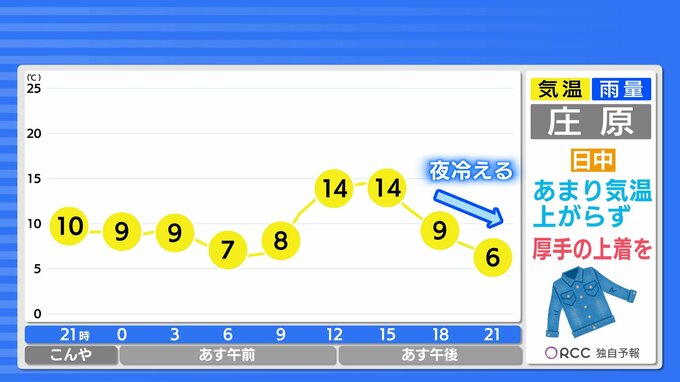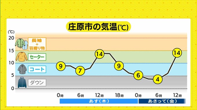 あすからあさってにかけては特に朝晩の冷え込みが厳しくなります。あさっての朝は、南部で1ケタの予想で北部では3~4℃まで下がる見込みです。山地では0℃近くまで冷え込むでしょう。冬物のコートやダウンジャケットなどの準備を早めにしておいた方が良さそうです。風邪を引かないようご注意ください。ただ冬型の気圧配置は一時的で、来週は平年よりも高い傾向が復活しそうです。