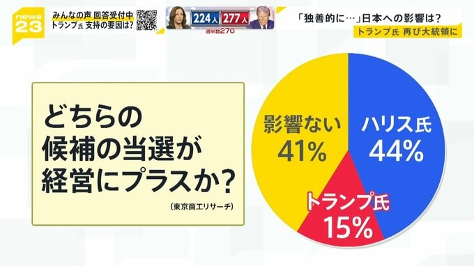 ある調査によりますと、「どちらの候補の当選が経営にプラスか」と日本企業に聞いたところ、トランプ氏と答えた企業は15%に留まっています。