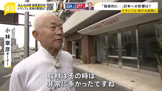 名前の由来は、建物が13階建てで、カードのトランプの13枚にちなんだもので、10年前に命名。トランプ氏と関係はありませんが、トランプ氏を蒲田から応援しています。ただ、この8年間のトランプ氏の言動から複雑な心境も。
