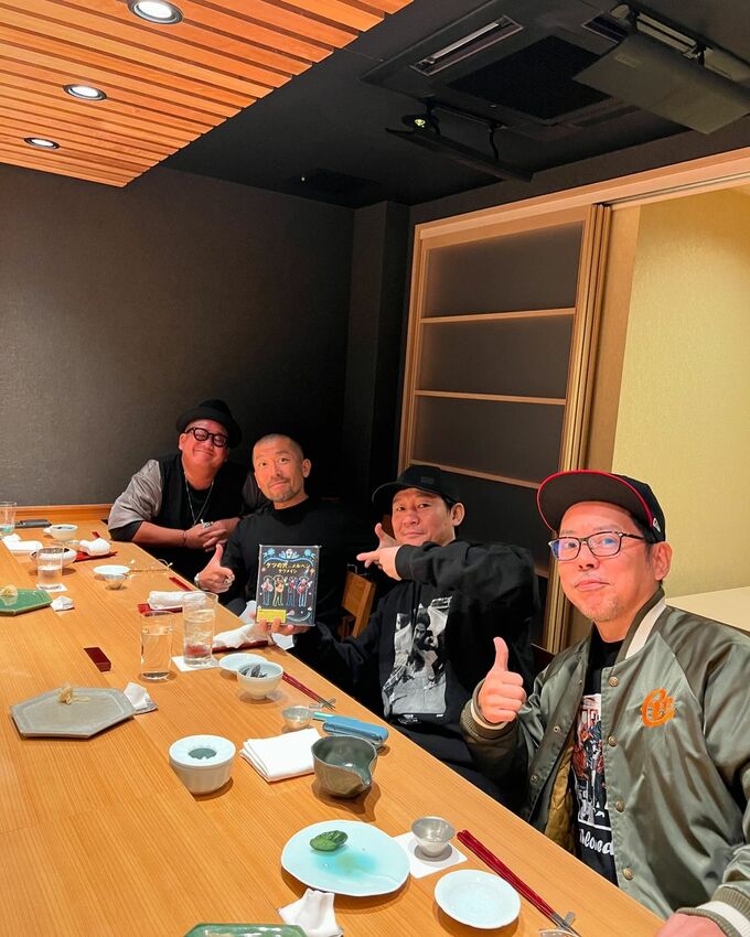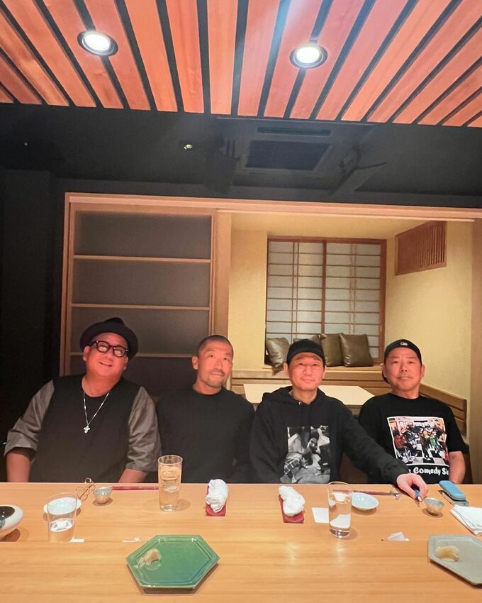 大蔵さんは「記憶が正しければ。。。結成約30年…メンバー4人だけで食事をした初めての場所が、まさかのお寿司屋さんのカウンターでした!!(俺たちも大人になったなー)」と綴ると、4ショット写真をアップ。