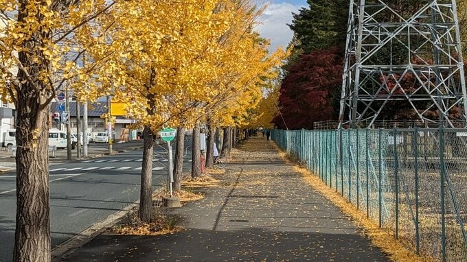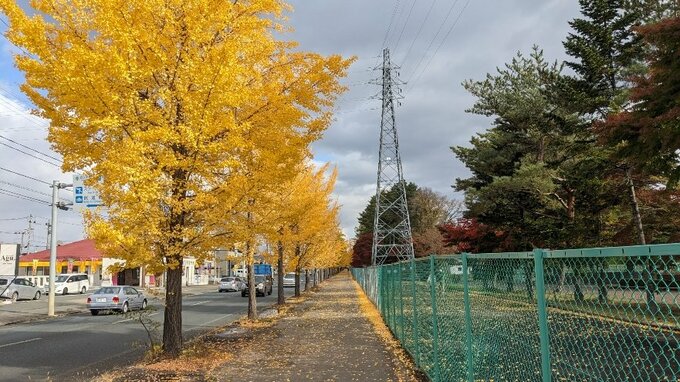 盛岡市の岩手県営運動公園脇の歩道では現在、イチョウの木々が黄色く色づき、見ごろを迎えています。