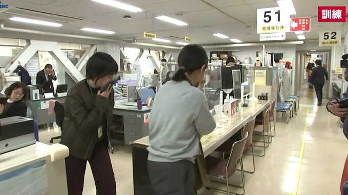 訓練では、職員で組織する「自衛消防隊」が初期消火や庁舎を訪れている人の避難の誘導の手順を確認し、避難誘導では実際に庁舎にいた市民を建物の外に案内していました。