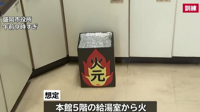 9日に始まる秋の全国火災予防運動を前に、盛岡市役所で7日、火事が起きたことを想定した避難と救助の訓練が行われました。