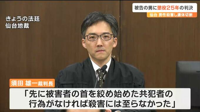 7日、仙台地裁で開かれた判決公判で、須田雄一裁判長は、「先にタオルで被害者の首を絞め始めた共犯者の行為がなければ殺害にまで至らなかった」とした一方で「怒りの感情から暴力を振るい始め殺害するに至っており情状酌量の余地は全くない」と指摘。