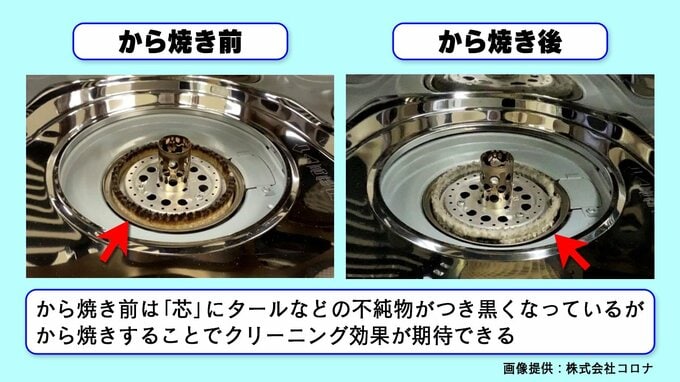 「石油ストーブを使用し続けると、芯にタールがついてしまうことがあります。芯の下のほうにびっしりと黒いかたまりのようなものがついているのですが、これがタールで、これを取り除く作業を『から焼き』というのですが、こちらをやっていただきたい」