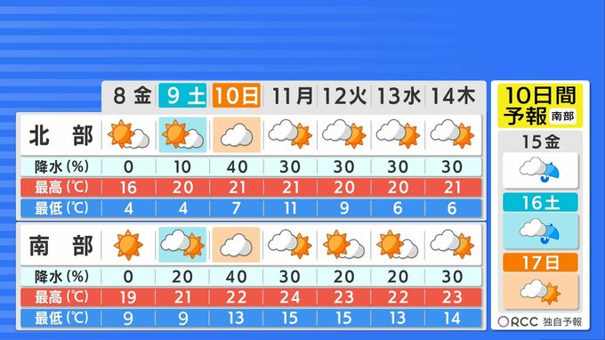 この先あさってにかけては高気圧に覆われ概ね晴れの天気になるでしょう。日曜日から月曜日にかけては低気圧や気圧の谷の影響で雲が広がりやすい予想です。あす、あさっての朝晩の冷え込みは厳しいですが、その後は上空にこの時期としては5℃近く高い暖かい空気が入る見込みで、平年よりもかなり高い傾向が復活しそうです。