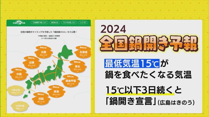 そしてきょうは「鍋の日」です。「最低気温15℃」が鍋が食べたくなる気温とされています。大手食品会社ミツカンは、この秋に全国で15℃を迎える時期を予想した「鍋前線2024」を発表しています。そして全国で最低気温15℃以下が3日間続いた日を「鍋開き」としています。