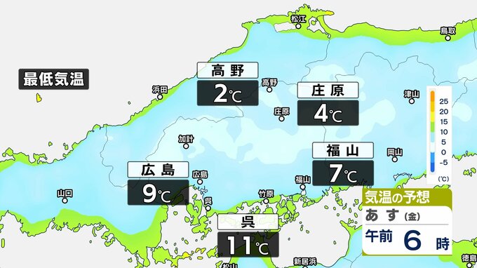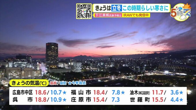 きょう7日(木)の広島県内は、冬型の気圧配置になり肌寒い一日でしたね。朝は各地で今シーズン一番の冷え込みになりました。神石高原町油木では3.6℃ 世羅では4.4℃ 広島市中区では10.7℃を記録しました。