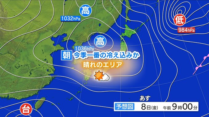 8日(金)冬型緩むが朝の冷え込み厳しい 各地で今季一番の冷え込みになる予想