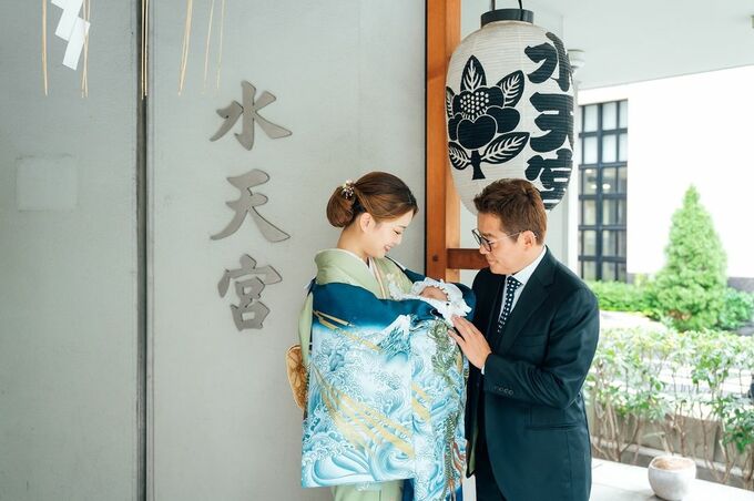 蜂谷さんは若緑色の付け下げの着物を着こなし、産着をかけて包み込んだ赤ちゃんを抱き、スーツで決めた井戸田さんとともにお宮参りする写真を投稿しています。