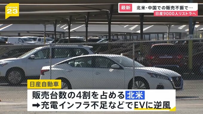 日産の販売台数の4割を占める北米では、充電インフラの不足や価格の高さからEVに逆風が吹いています。トヨタやホンダは、ハイブリッド車の販売で収益を出していますが、日産には北米で売るハイブリッド車がありません。