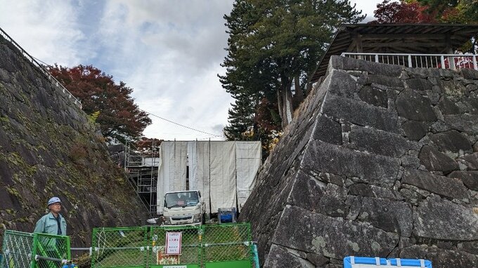 人気の撮影スポットである渡雲橋は工事中のため、白い幌がかけられており、立ち入ることはできませんが、二の丸、本丸はかなり紅葉が進んできました。