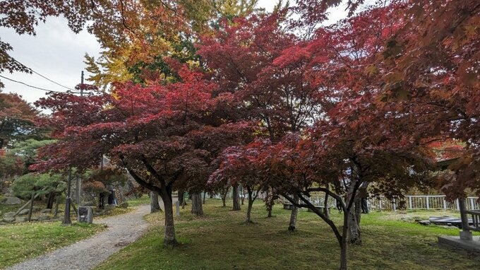 盛岡市内丸の盛岡城跡公園の木々も一気に色づきを深めています。