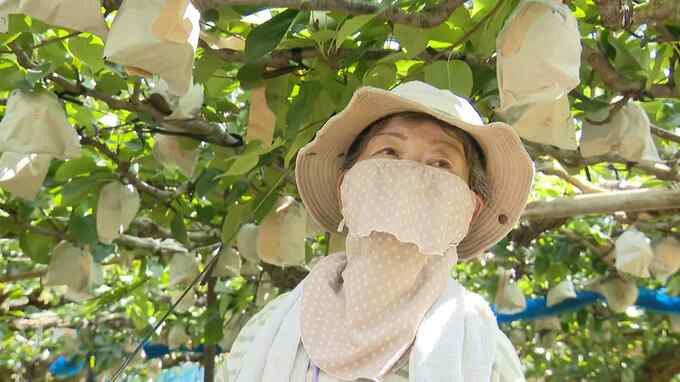 同じうきは市にある観光農園を訪ねました。約3000個の梨が収穫時期を迎えています。台風の接近に備え、風で落ちないようテープで固定するなど対応に追われていました。