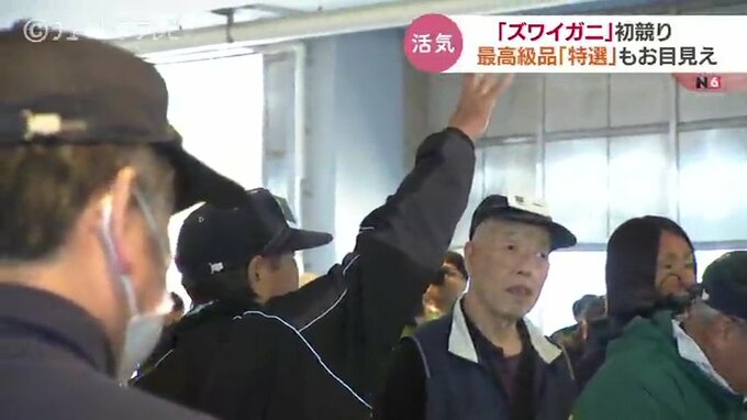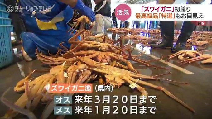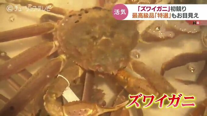 日本海の冬の味覚ズワイガニの季節がやってきました。富山県射水市の新湊漁港では今シーズンの初競りが行われ、厳しい基準をクリアした最高級品「特選」もお目見えしました。