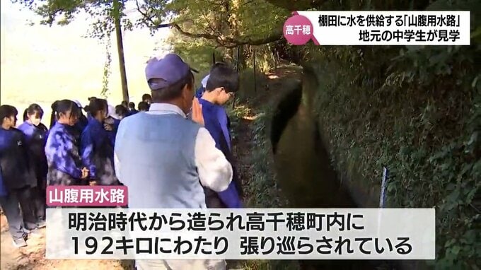 宮崎県高千穂町では、「祖母・傾・大崩ユネスコエコパーク」と世界農業遺産に認定されていることを実感してもらおうと、地元の中学生が棚田に水を供給する山腹用水路を見学しました。8日は、高千穂中学校の1年生お…