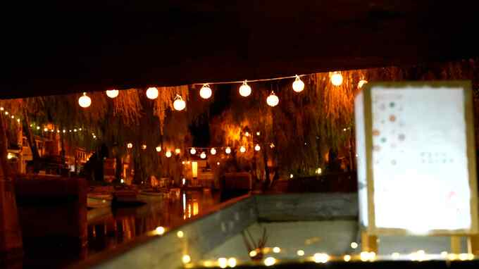 コースの終盤、曲線に沿って並べられたLEDライト。夜になると・・・舟の動きに合わせて光が動き、色も変化します。さらに最後の橋をくぐると、ちょうちんの明かりに照らされた美しい柳川の町並みが広がっています。