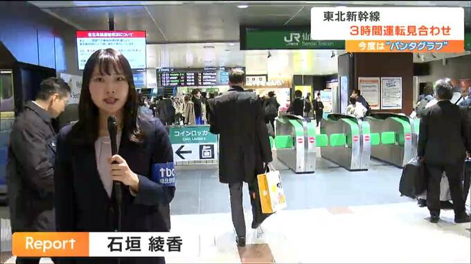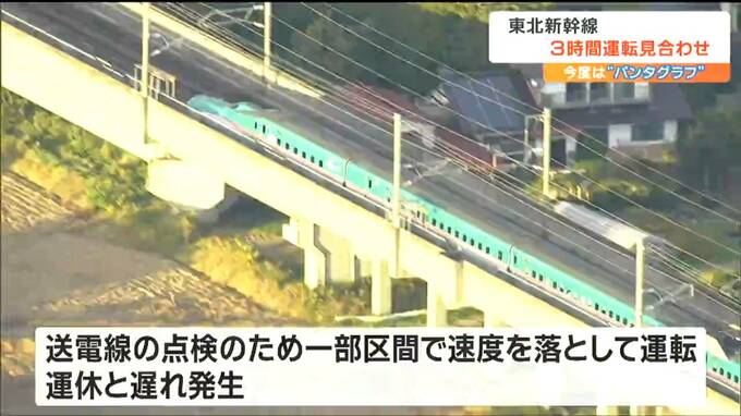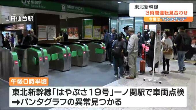 JR東北新幹線は8日午後、パンタグラフの異常が見つかり、仙台駅と新青森駅の間の下りでおよそ3時間にわたり運転を見合わせました。ダイヤの乱れはいまも続いています。