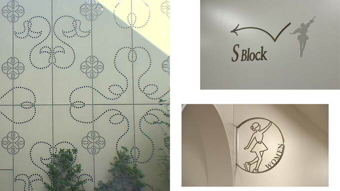 クラシカルな感じをイメージして作られた施設の壁面には「コンパルソリー」と呼ばれる氷上に図形を正確に描くフィギュアスケートの旧種目の図形が描かれ、施設内には、浅田さんのシルエットがおよそ10人、トイレのピクトグラムもスケーター仕様になっているなど、浅田さんならではの遊び心満載のこだわりが隠れている。