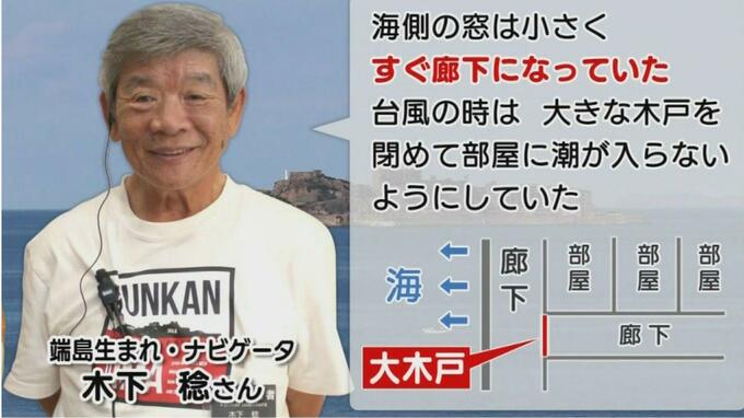 さらに、台風の時は「外に面する廊下」と「部屋」の間に設置した大きな木の扉、木戸を閉めて、できるだけ居住スペースに潮が入らないように工夫がされていたということです。